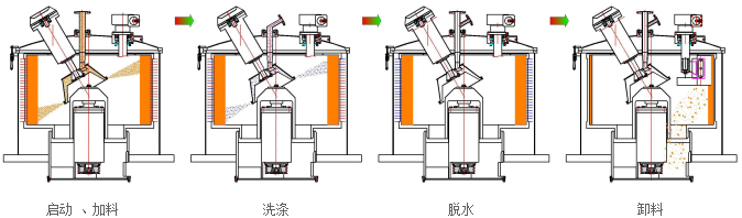 電機帶動皮帶輪驅動轉鼓繞自身軸線高速回轉,物料在預先編制的程序控制下,通過進料系統(tǒng)進入高速旋轉的轉鼓內。在離心力的作用下,物料均布在過濾介質上進行脫液分離,液相透過固相物料和濾網(wǎng)縫隙,經(jīng)鼓壁孔甩至機殼空間,從出液口排出機外,固相物料截留在轉鼓內形成濾餅。料層檢測裝置實時檢測物料的充填位置,當濾餅達到事先設定的位置時,自動關閉加料閥,停止進料,然后對濾餅進行洗滌、脫水,待達到要求后,離心機降到卸料速度,刮料器在液(氣)動控制下將濾餅刮下,經(jīng)轉鼓底上的出料口卸出。