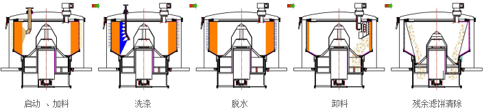 電機帶動皮帶輪驅(qū)動轉(zhuǎn)鼓繞自身軸線高速回轉(zhuǎn),物料在預先編制的程序控制下,通過進料系統(tǒng)進入高速旋轉(zhuǎn)的轉(zhuǎn)鼓內(nèi)。在離心力的作用下,物料均布在過濾介質(zhì)上進行脫液分離,液相透過固相物料和濾網(wǎng)縫隙,經(jīng)鼓壁孔甩至機殼空間,從出液口排出機外,固相物料截留在轉(zhuǎn)鼓內(nèi)形成濾餅。料層檢測裝置實時檢測物料的充填位置,當濾餅達到事先設(shè)定的位置時,自動關(guān)閉加料閥,停止進料,然后對濾餅進行洗滌、脫水,待達到要求后,離心機降到卸料速度,刮料器在液(氣)動控制下將濾餅刮下,經(jīng)轉(zhuǎn)鼓底上的出料口卸出。離心機繼續(xù)降速,氣動拉袋裝置上下快速往復運動,將殘余濾餅抖落,實現(xiàn)濾餅的完全清除。