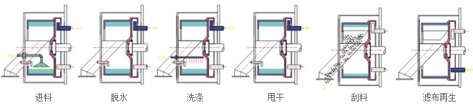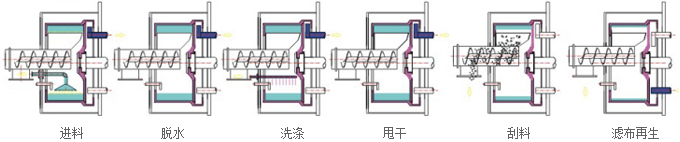 電機(jī)帶動皮帶輪驅(qū)動轉(zhuǎn)鼓繞自身軸線高速回轉(zhuǎn),反沖管向虹吸室內(nèi)灌液排除虹吸管內(nèi)的空氣,物料在預(yù)先編制的程序控制下,通過進(jìn)料系統(tǒng)進(jìn)入高速旋轉(zhuǎn)的轉(zhuǎn)鼓內(nèi)。在離心力和虹吸抽離的雙重作用下,物料均布在過濾介質(zhì)上進(jìn)行脫液分離,液相透過固相物料和濾網(wǎng)縫隙,經(jīng)過濾內(nèi)轉(zhuǎn)鼓壁孔和虹吸室的通孔進(jìn)入虹吸室,再由虹吸管抽走排出機(jī)外,固相物料截留在過濾轉(zhuǎn)鼓內(nèi)形成濾餅。料層檢測裝置實(shí)時(shí)檢測物料的充填位置,當(dāng)濾餅達(dá)到事先設(shè)定的位置時(shí),自動關(guān)閉加料閥,停止進(jìn)料,然后對濾餅進(jìn)行洗滌、脫水,待達(dá)到要求后,離心機(jī)降到卸料速度,卸料閥打開,刮料器在液動控制下旋轉(zhuǎn)上升,將濾餅刮下掉進(jìn)螺旋出料器,經(jīng)出料閥排出機(jī)外。